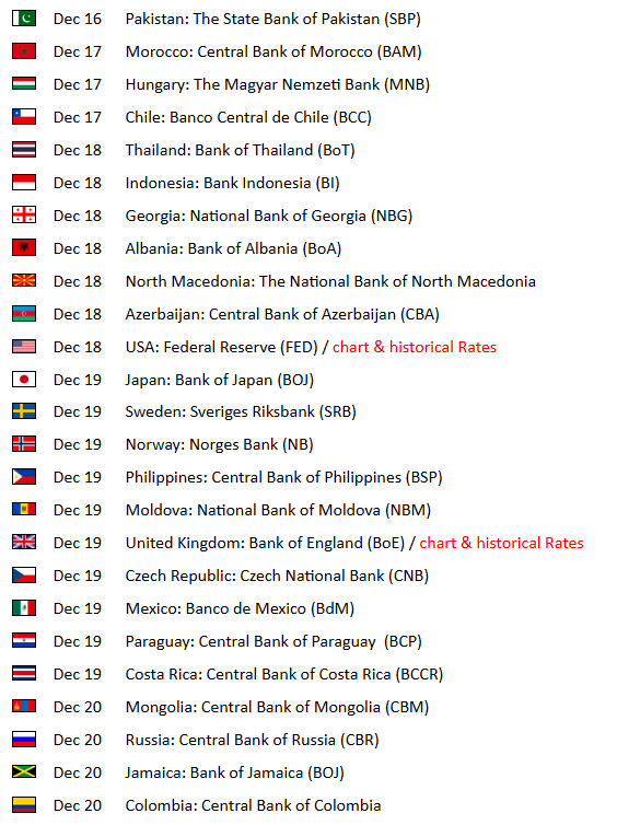 周四(12月19日):日本央行、瑞典央行、挪威央行、菲律宾央行、摩尔多瓦央行、英国央行、捷克央行、墨西哥央行、巴拉圭央行、哥斯达黎加央行;