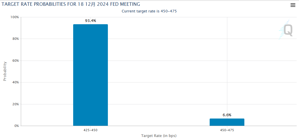 利率期货市场的交易员预计,美联储在12月17-18日的会议上降息25个基点的可能性高达93%。不过由于近期美国经济数据走强,加大了美联储在2025年初暂停降息的风险。鲍威尔在会后新闻发布会上讲话和最新的利率点阵图预测将显得至关重要。