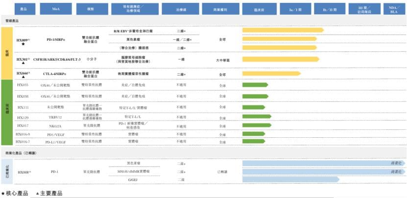 自2016年起,公司一直打造创新管线,已开发由共10种候选药物组成的管线,包括核心产品HX009及两种主要产品HX044及HX301,其中有八种针对肿瘤学的候选药物及两种针对自身免疫疾病的候选药物。