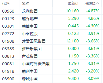 房地产股中,龙湖集团(00960.HK)、越秀地产(00123.HK)、雅居乐集团(03383.HK)分别下跌4.87%、4.86%、3.61%。