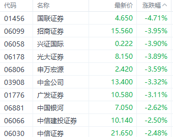 券商股中,国联证券(01456.HK)、招商证券(06099.HK)、光大证券(06178.HK)分别下跌4.71%、3.95%、3.89%。