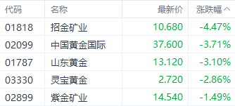 黄金股中,招金矿业(01818.HK)、中国黄金国际(02099.HK)、山东黄金(01787.HK)分别下跌4.47%、3.71%、3.10%。
