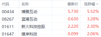 加密货币概念股中,博雅互动(00434.HK)、蓝港互动(08267.HK)、新火科技控股(01611.HK)分别上涨5.52%、3.28%、2.30%。