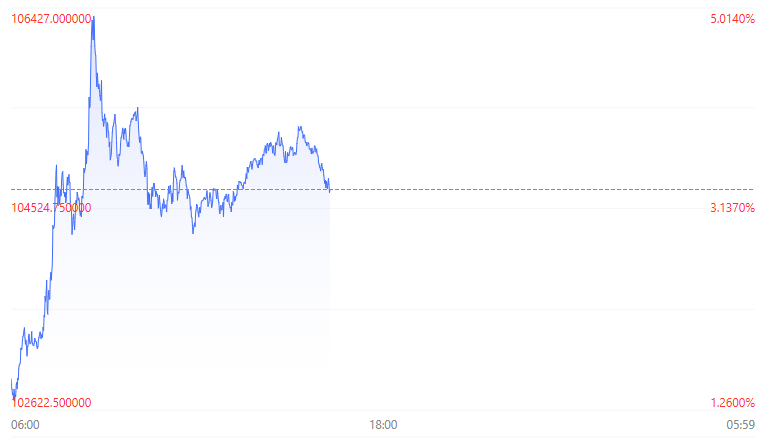 消息方面,今日比特币价格早盘续创历史新高,盘中一度触及106427美元。截至发稿,涨1.50%,报104707.18 美元。