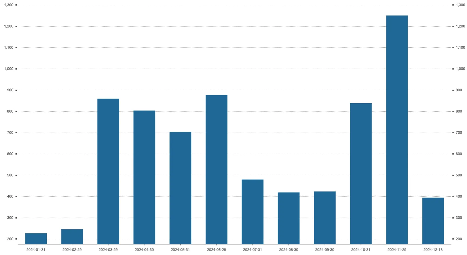 值得注意的是,港股9月在增量政策预期带动下短线飙涨,但随即在10月,11月就迎来连续回调行情。期间,南向资金又一次出手“托市”,分别大幅净买入约838和1250亿港元。11月的1250亿港元更是创下近4年以来单月流入新高。