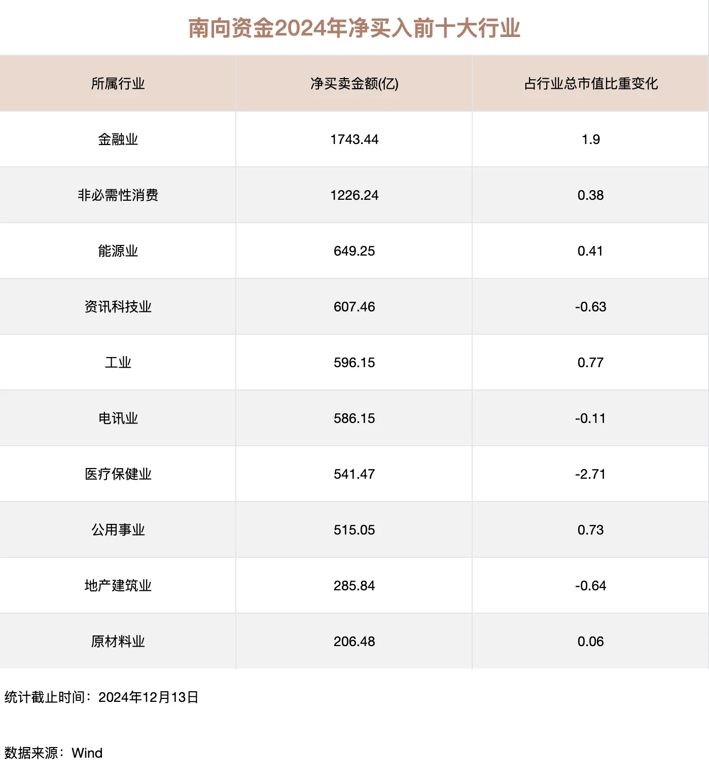 截至上周五,从南下资金流向的结构上,金融、非必选消费及能源成为年内资金流入的前三大行业。流入规模分别达1743.44亿港元、1226.24亿港元及649.25亿港元。