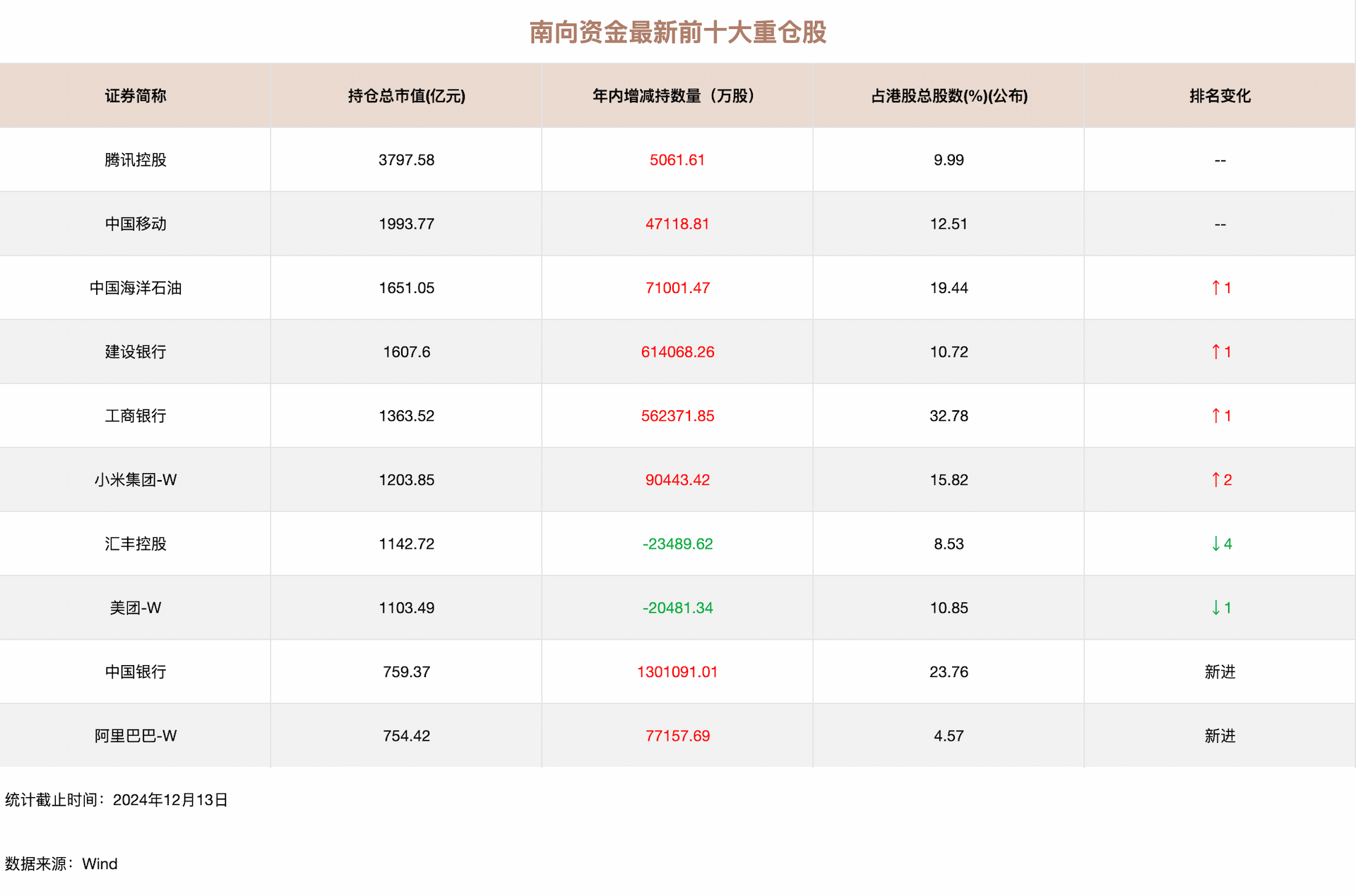 个股方面,南向资金前十大重仓股出现一些变化,腾讯、中国移动继续稳居前二,年内还分别获得增持5062万股及4.71亿股。
