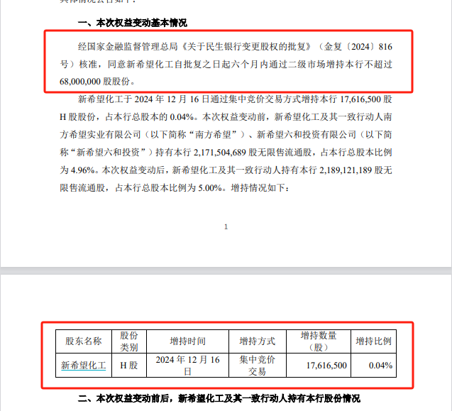 12月14日,民生银行刚刚公告收到《国家金融监督管理总局关于民生银行变更股权的批复》(金复〔2024〕816号),透露出新希望化工投资有限公司(以下简称“新希望化工”)自批复之日起六个月内通过二级市场增持的总数为不超过68,000,000股。