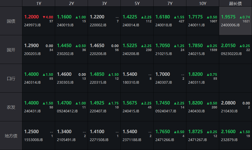 银行间主要利率债收益率多数上行。截止北京时间16:30,10年期国债活跃券240011收益率上行0.5bp报1.7175%,30年期国债活跃券2400006收益率上行0.74bp报1.9575%,10年期国开活跃券240215收益率上行0.25bp报1.785%。