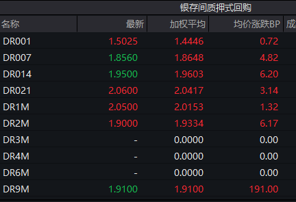 银银间回购定盘利率多数上涨。FDR001报1.4500%,与前一交易日持平;FDR007报2.0000%,涨15.00个基点;FDR014报1.9000%,涨2.00个基点。