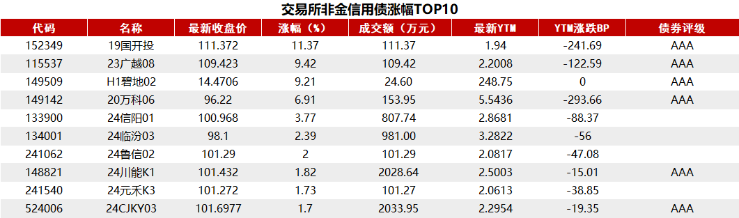 据Choice 数据统计显示,今日交易所市场非金信用债涨幅排行前五的分别是:19国开投、23广越08、H1碧地02、20万科06、24信阳01。具体如下: