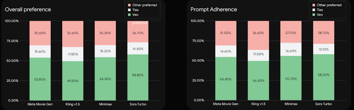 从上述案例可见,Veo 2在真实世界还原以及Prompt指令遵循方面都有不错的表现。而在谷歌官网发布的性能评估中,Veo 2同样打败了Sora Turbo、可灵、MiniMaX等一众海内外AI文生视频大模型。