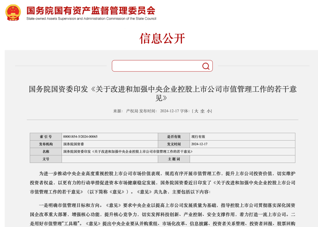 12月17日,国务院国资委发布《关于改进和加强中央企业控股上市公司市值管理工作的若干意见》(下称),共九条。