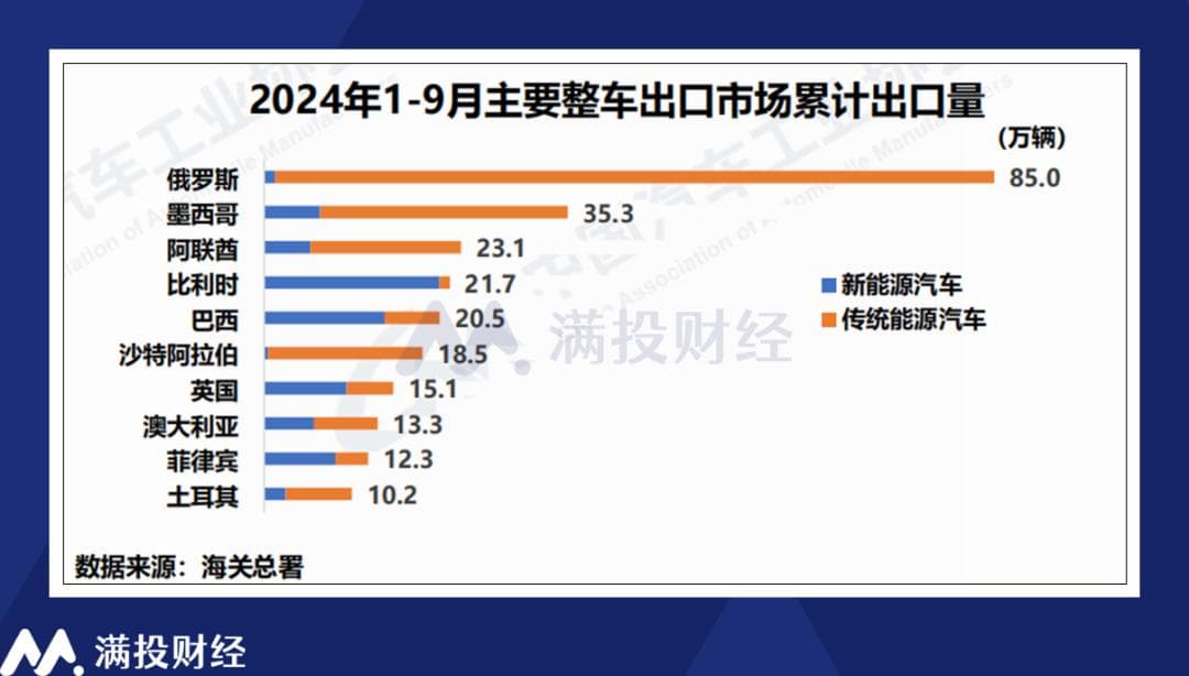 根据海关总署披露的信息来看,截至9月,中国主要汽车出口市场前三为俄罗斯、墨西哥以及阿联酋。而聚焦到新能源汽车市场,则是比利时、巴西和英国。尽管在市场舆论中,中国汽车面临着来自海外市场的政策限制,但同样也有不少国家对中国出口的汽车产品抱有欢迎态度。在未来的汽车出口战略中,相较于打破欧美市场的壁垒限制,开发更多新的国际市场或许会是车企会选择的方向。