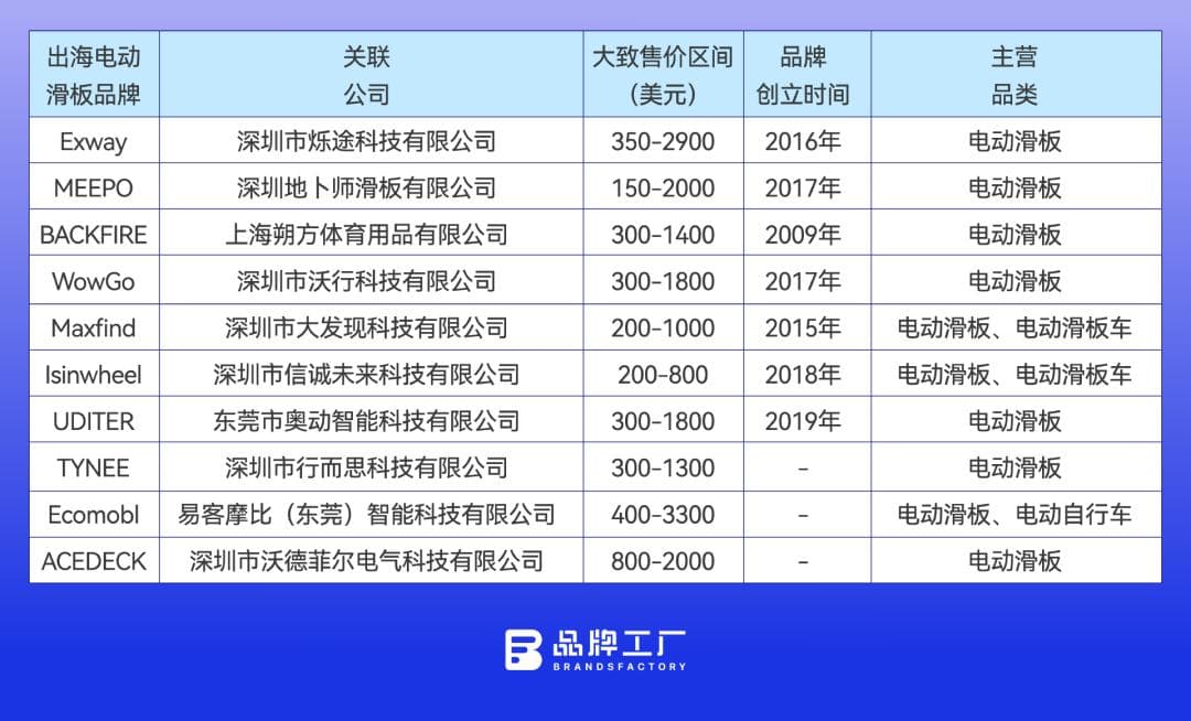 以谷歌搜索热度较高的品牌为例,MEEPO、Exway、Isinwheel、BACKFIRE的关联公司分别是深圳地卜师滑板有限公司、深圳市烁途科技有限公司、深圳市信诚未来科技有限公司、上海朔方体育用品有限公司,只有一个公司不是深圳的。