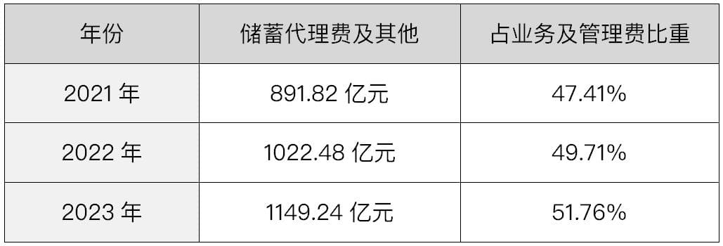 不同于其他银行全部是自营网点,邮储银行的3.9万多家线下网点,很大部分是由母公司中国邮政集团代理的。而这些代理网点,都需要给邮政集团上交代理费。最近三年邮储银行的代理费越交越多,2023年上交的代理费高达1149.24亿元,已经超过邮储银行当年862.70亿元的归母净利润。