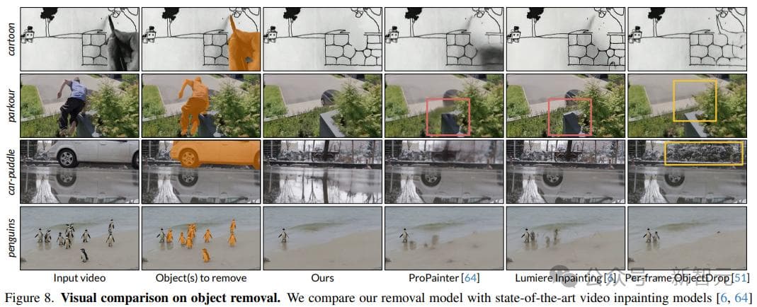 在物体移除方面,视频修复模型无法移除输入掩码外的软阴影和反射;ObjectDrop可以移除cartoon和parkour中的阴影,但独立处理每一帧,并且没有全局上下文的情况下修复区域,会导致不一致的幻觉。