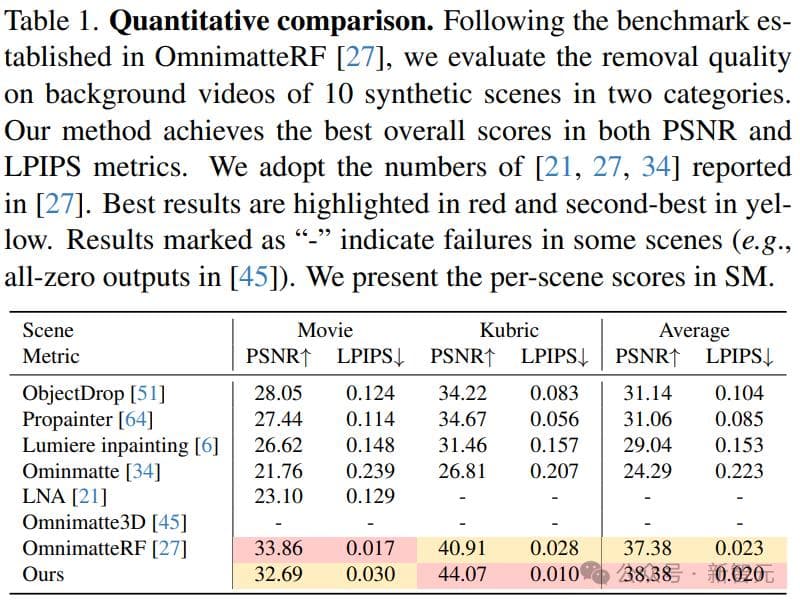 研究人员采用OmnimatteRF评估协议来评估十个合成场景的背景层重建效果,包括5个电影场景和5个由Kubric生成的场景,每个场景都有一个对应的真实背景,不包含前景对象和效果。