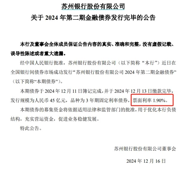 最新数据显示,苏州银行于12月11日发行的金融债“24苏州银行债02”票面利率降至1.90%,为国内商业银行普通金融债(非绿色金融债和小微企业债)发行利率首度跌破2.0%。据了解,该金融债发行规模为人民币45亿元,品种为3年期固定利率债券,债券主体评级为AAA。