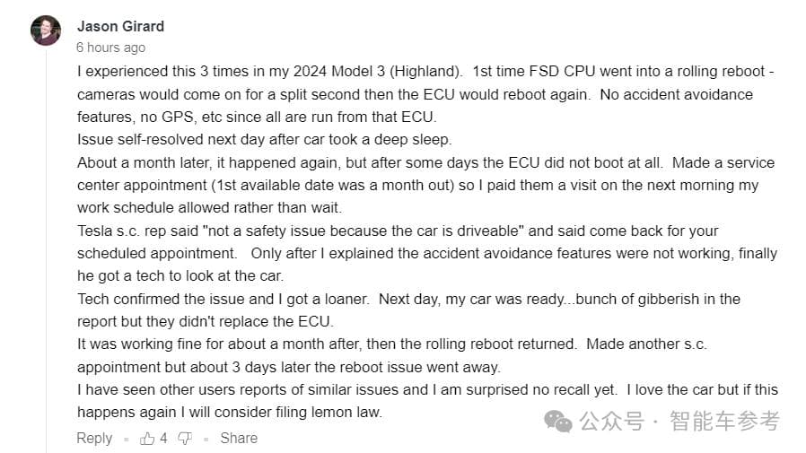 (内容大意是,他经历了三次相关故障,FSD CPU 进入滚动重启状态,没有事故避免功能,没有 GPS,经特斯拉技术服务修好后依然会出现。)