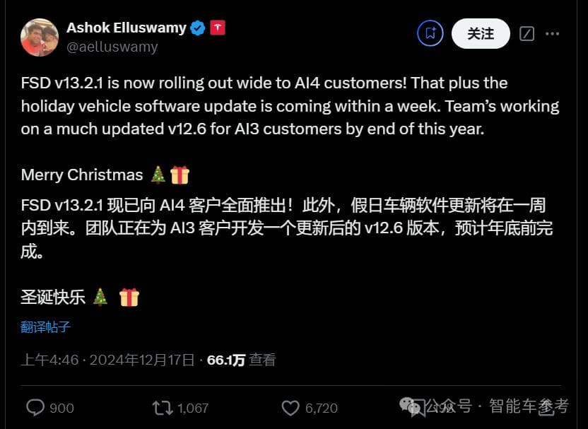 特斯拉的自动驾驶和AI软件副总裁Ashok Elluswamy,在X平台上宣布,FSD v13.2.1已向HW4.0客户全面推出,而HW3.0则将更新为v12.6版本。