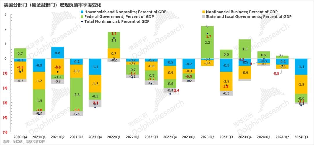 首先宏观负债率上,因为财政收入增加后,美国联邦财政赤字率稳步向下,带动三季度的美国各大经济部门终于全部进入去杠杆状态。