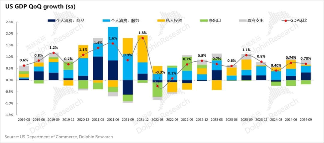 宏观杠杆率降下来了,但是三季度GDP增长并未降速,三季度环比折年还有2.8%的增长,居民的商品和服务消费是仍然是驱动经济增长的核心动力。