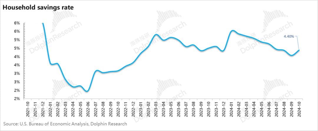 但从居民的资产负债表上一个比较奇怪的地方是,虽然三季度居民部门储蓄率(收入中分配给储蓄的份额,可以是存款或者是理财)占比持续下降,但居民资产负债表上的居民存款额(deposits)不降反增(同比和环比均是如此),而且居民持有的权益资产环比由于股债同涨,还在持续增长中。