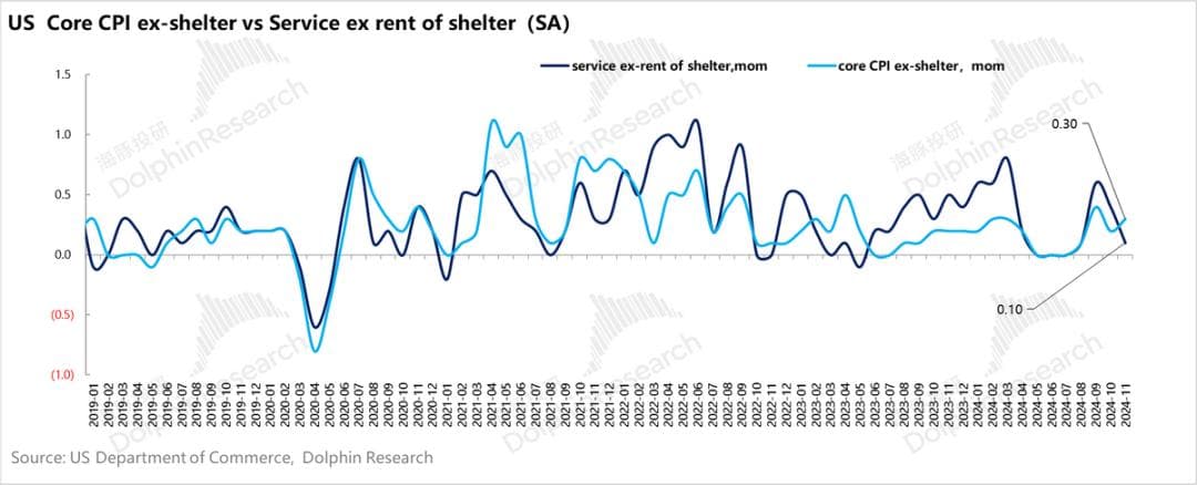 但上个月很不一样的一个地方是,11月核心通胀的小幅抬头并不是服务通胀或者是居住通胀导致的,尤其是服务中保险、医疗、交通等类目物价均非常平稳。
