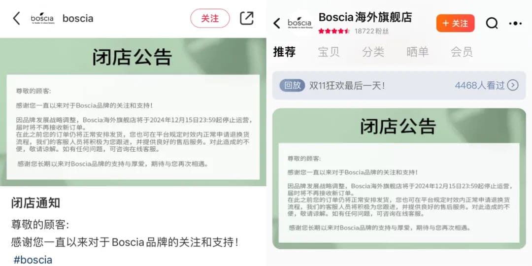 今年5月,boscia博倩叶品牌官网及海外官方账号发布公告,表示将于5月31日关闭网站,时隔大半年,boscia博倩叶海外旗舰店也宣布自12月15日23:59起停止运营。