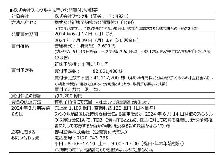 最终,麒麟控股将芳珂集团的要约收购价格上调了4.1%,即以每股2800日元(约合人民币135.54元),共计花费约2300亿日元(约合人民币约111亿元)的价格,收购芳珂集团5194.69万股份,并将投标截止日期延长至8月28日。