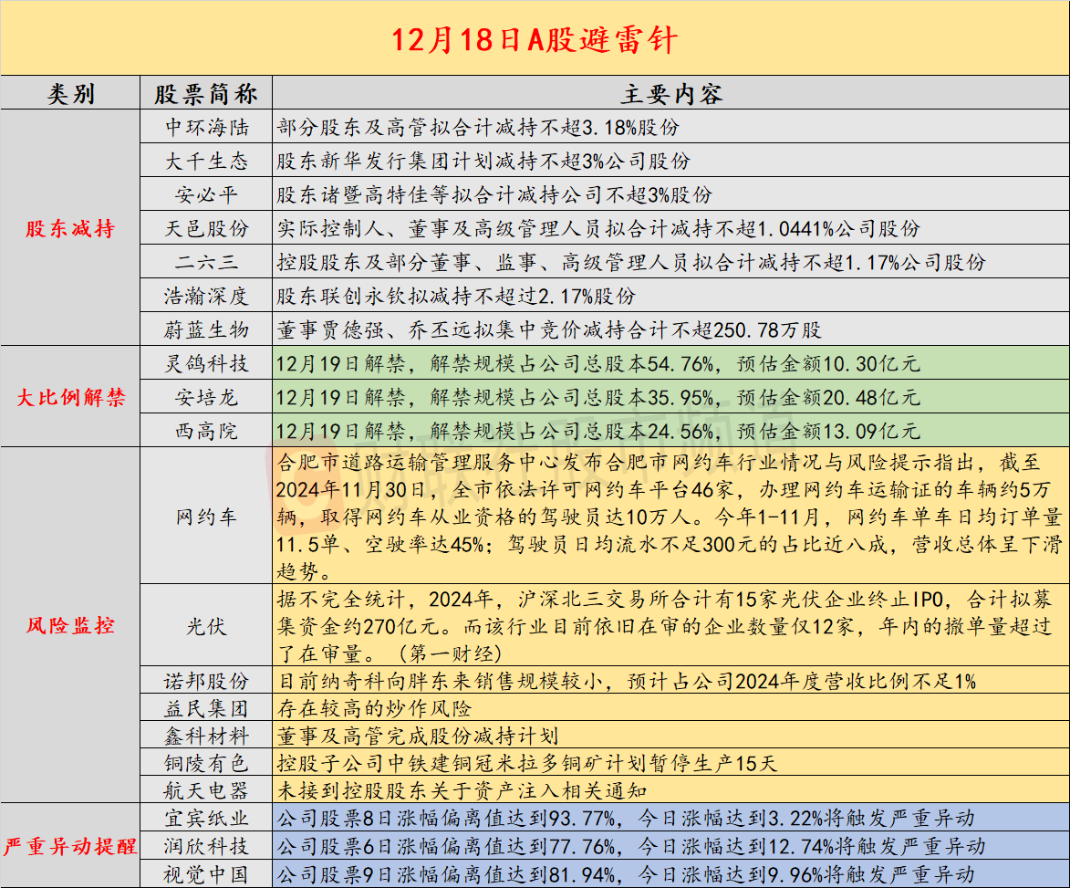 12月18日投资避雷针:3连板人气股澄清 对胖东来的销售所占营收比例不足1%