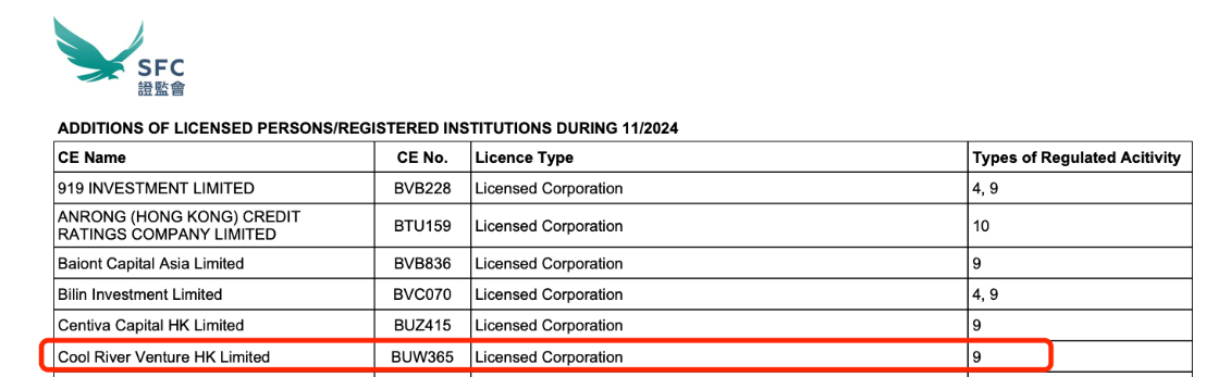 根据香港证监会网站的公告,Cool River Venture HK Limited公司在2024年11月获得了获得香港证监会颁发的9号牌,即资产管理牌照,获颁牌照后,公司可在香港开展资管服务业务。