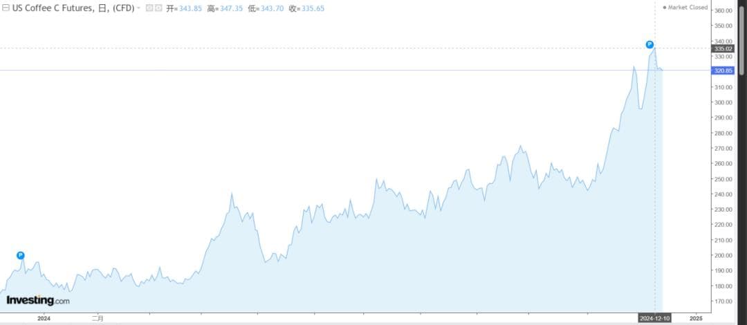 从数据上看的确如此,从11月起,国际咖啡期货价格就在一路飞涨。12月10日晚,美国C型咖啡期货(KC.NYB)价格再创新高,最高触及345.55美分/磅,与今年年初相比,涨幅接近70%,创下自1977年以来的价格新高。