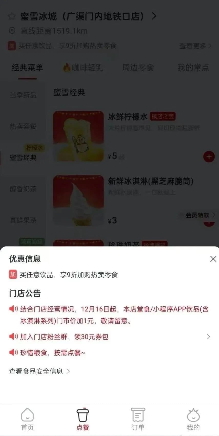 12月16日,广州、深圳等地的蜜雪冰城门店通过小程序发布公告称,受综合门店经营情况的影响,自12月16日起,本店堂食和小程序APP上的饮品价格将上调1元。