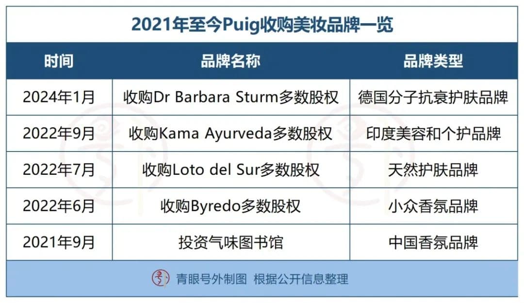 此外,Puig集团深谙“鸡蛋不能放在同一个篮子里”,近年来不断通过收购和投资举措来完善自身的商业版图。据青眼号外不完全统计,自2021年至今,Puig集团一连收购了印度美容和个人护理品牌Kama Ayurveda、小众香氛品牌Byredo、德国分子抗衰护肤品牌Dr Barbara Sturm等,此前还投资了中国香氛品牌气味图书馆。