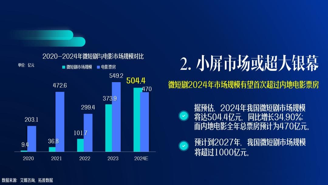 2024年即将过去,据中国网络视听协会《中国微短剧行业发展白皮书(2024)》预估,今年我国微短剧市场规模将达504.4亿元,有望超过电影票房总收入。在经济不景气的大环境下,电影市场乏力的小氛围中,一个个冰冷的数字在告诉我们,现在电影行业进入了下行期。然而,电影市场难道就真的没有亮点和增量空间吗?