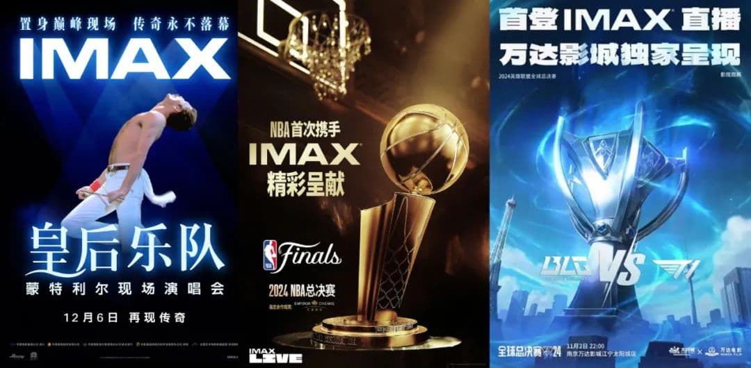 影院终端方面,IMAX也进行了颇为创新的尝试,首先是助力将《皇后乐队蒙特利尔现场演唱会》引进到大陆市场,还包括将NBA总决赛实况直播放在中国香港、中国台湾IMAX院线,以及将英雄联盟S14总决赛放到IMAX直播,上座率高达90%。