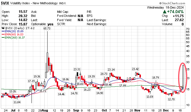 事实上,美股“恐慌指数”VIX在昨夜一天内就暴涨了74%,创下了四个月来的最高位28.32,单日的涨幅比8月黑色星期一时还要大!
