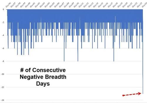 标普500指数已经连续13天出现下跌的成分股数量多于了上涨的成分股数量,继续延续着近100年历史上第二长的纪录。