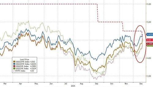 在债市方面,周三除了美债收益率本身的大涨外,一个有意思的现象是,长债收益率——30年期美债收益率和10年期美债收益率,目前均已超过了美联储联邦基金利率目标的上限4.5%。而2年期和5年期美债收益率也在升向这一关口,这对于尚处于降息周期里的市场而言,其实是一个颇为玩味的信号——债市似乎已并不相信美联储还能再降多少息……