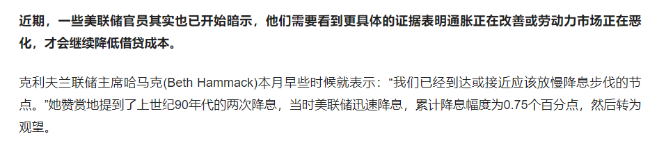 颇为巧合的是,哈马克其实是除了鲍威尔之外,我们昨日前瞻文章中唯一提到过的一位美联储官员。我们曾介绍过,哈马克本月早些时候就表示,美联储已经到达或接近应该放慢降息步伐的节点。她还赞赏地提到了上世纪90年代的两次降息,当时美联储迅速降息,累计降息幅度为0.75个百分点,然后转为观望。