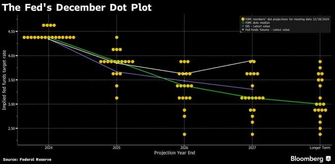 在本次会议如预期宣布降息25个基点至4.25%-4.5%后,美联储公布的利率“点阵图”显示,预计到2025年将仅再降息两次。这与9月点阵图预测相比,计划中的降息次数出现了减半——当时预计明年将降息四次。美联储官员还预计2026年将再降息两次,2027年再降一次。