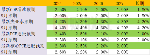 其中,通胀预估的变动可能是格外值得重视的。美联储最新预计,2025年总体和核心PCE物价指标均将落在2.5%,较9月的预估大幅上调。同时,到了2026年这两组预测已依然无法回到2%的通胀目标内。