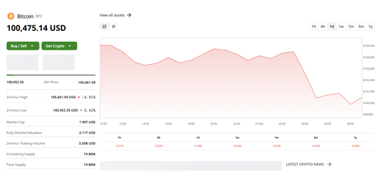 在美联储主席鲍威尔周三表示,联储不打算持有数字货币,并暗示将对明年降息采取更谨慎的态度后,比特币价格急挫,过去24小时下跌了近5%。本周早些时候,该加密货币一度创下108000美元以上的历史新高。