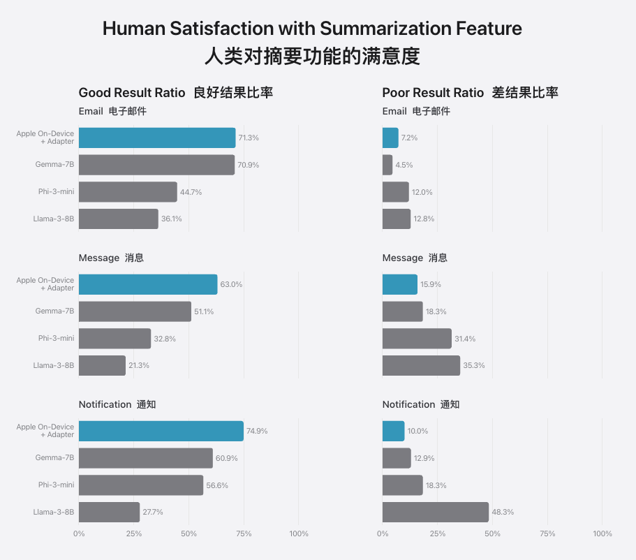 苹果官网发布的研究也显示,端侧模型总结能力的满意度,大致就在70%左右。虽然结果比起竞品的迷你模型稍好一些,但依然距离“不出重要差错”相去甚远。