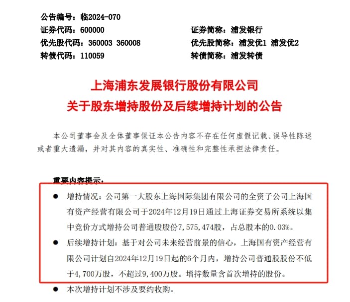 此外,浦发银行公告称,基于对公司未来经营前景的信心,国资经营公司计划自2024年12月19日起的6个月内,增持公司普通股股份不低于4,700万股,不超过9,400万股。增持数量含首次增持的股份。国资经营公司承诺,在本次增持计划实施期间及实施完成后5年内不减持。