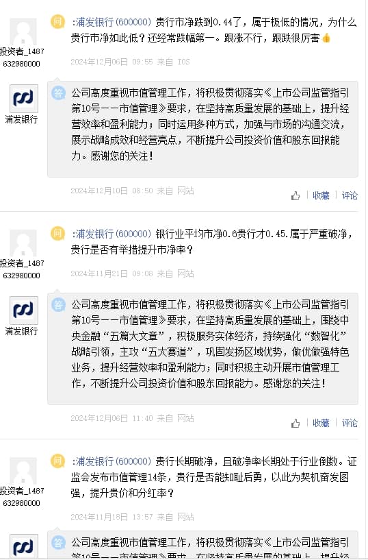 12月6日和12月10日,浦发银行连续回应此前投资者提问称,公司高度重视市值管理工作,将积极贯彻落实《上市公司监管指引第10号——市值管理》要求。并表示,积极主动开展市值管理工作,不断提升公司投资价值和股东回报能力。