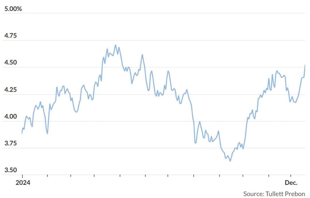 债券也未能幸免,10年期美债收益率飙升至4.5%。过去八个交易日中,10年期美债收益率有六个交易日出现上升,并且较9月创下的52周低点3.62%上升了0.87个百分点。