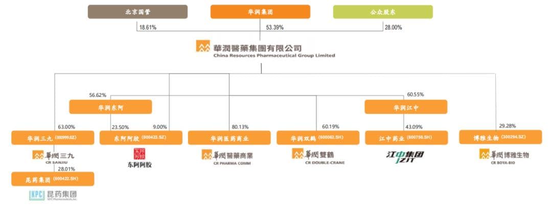 俯瞰华润系“医药帝国”,遍布医药行业的各个细分领域,仅实际控制的上市公司就多达9家。其中A股7家,包括华润三九、江中药业、东阿阿胶、昆药集团、华润双鹤、博雅生物、迪瑞医疗;港股2家,包括华润医药和华润医疗。港股的华润医药作为集团整体上市的母公司,直接控盘所有的医药资产。